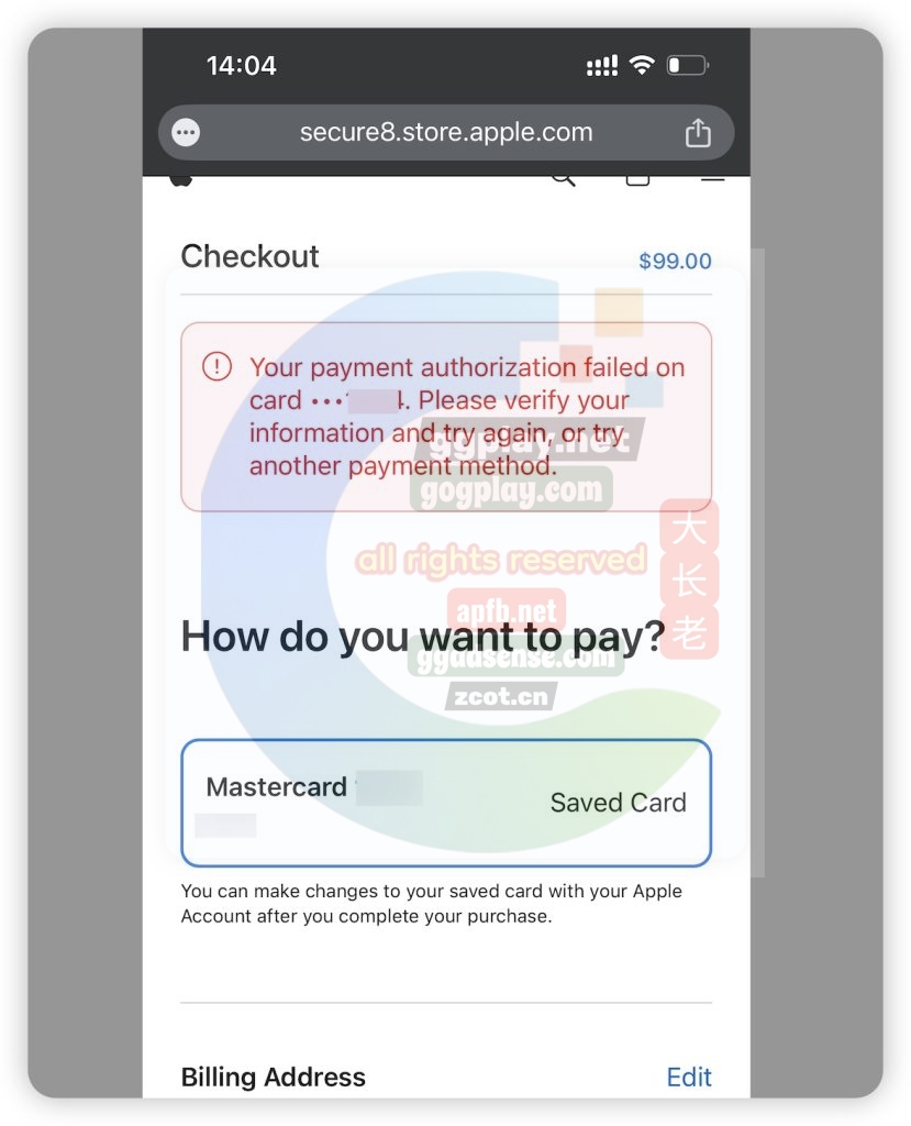 提交99美元付款后,还是提示付款授权失败,如下图。