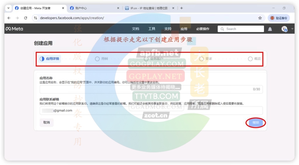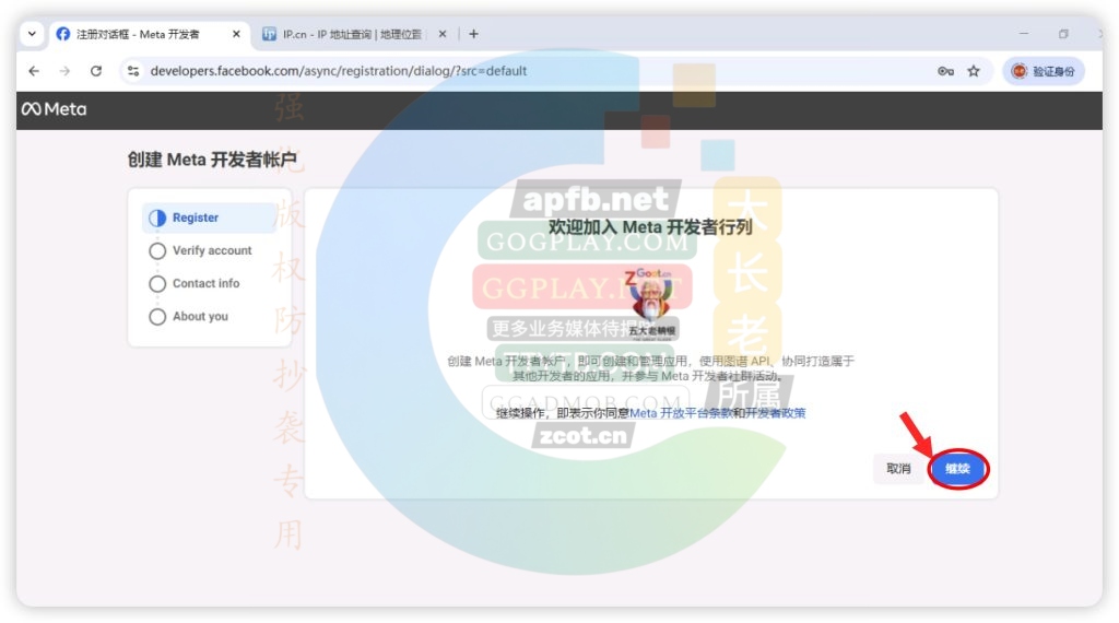 首先必须要有一个facebook账号,然后打开开发者注册链接https://developers.facebook.com/async/registration,然后点击继续,如下图。