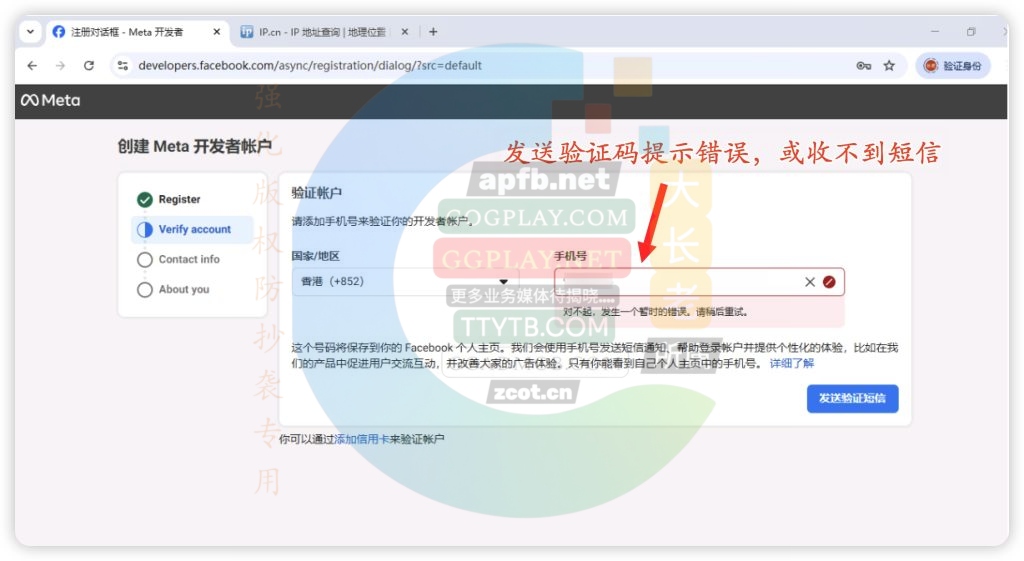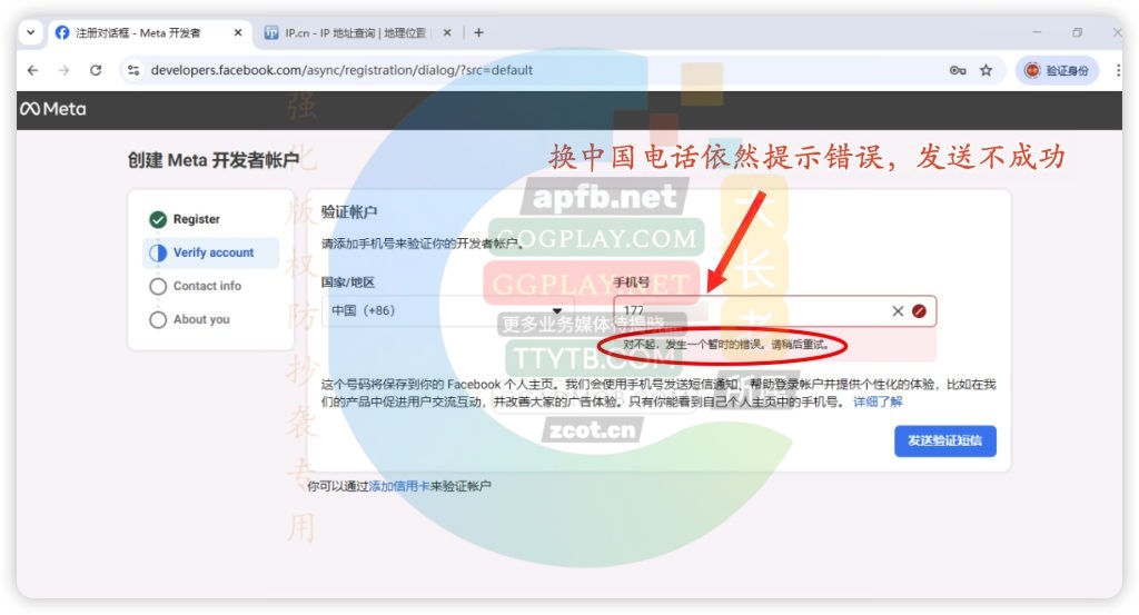 随后,大长老又尝试更换了中国电话号码,还是一样的错误提示,说明不行了。如下图