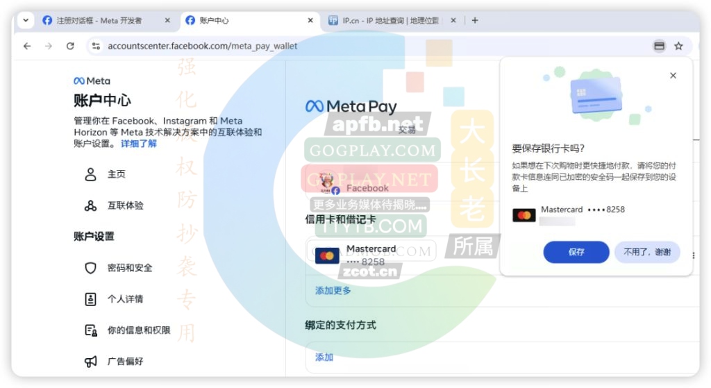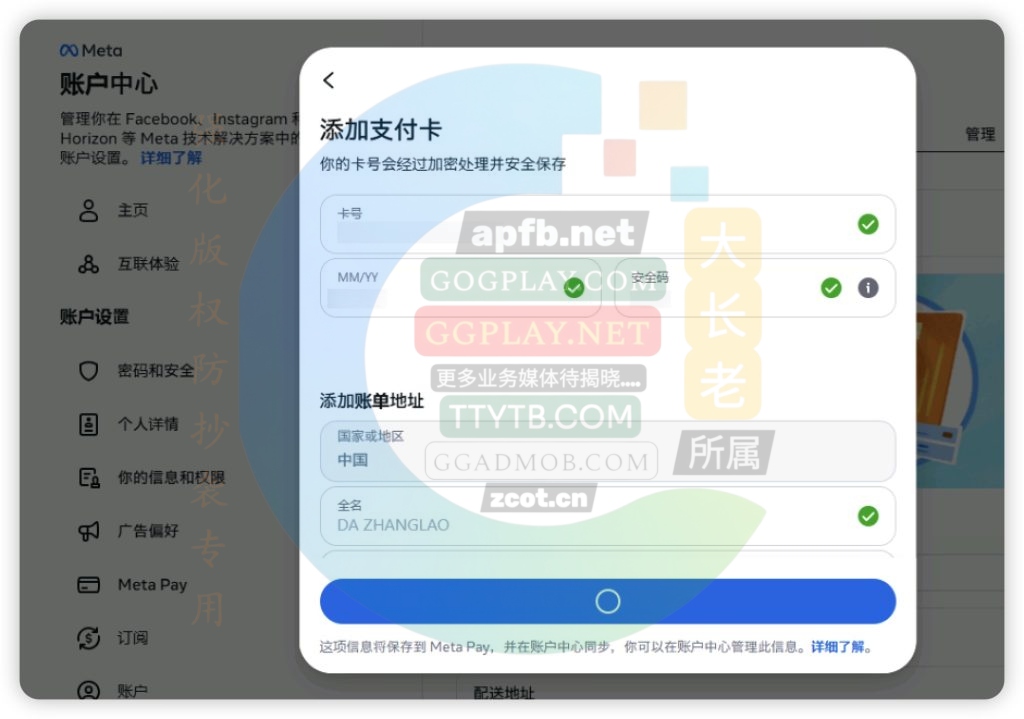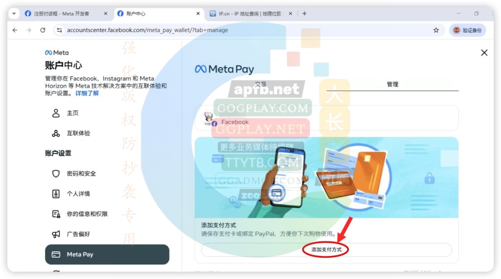 在电话验证无法继续的时候,我们可以看到页面底部的提示:你可以通过添加信用卡来验证账户,之后我们来到FB账户中心,点击订单与支付,点击前往 Meta Pay,如下图。