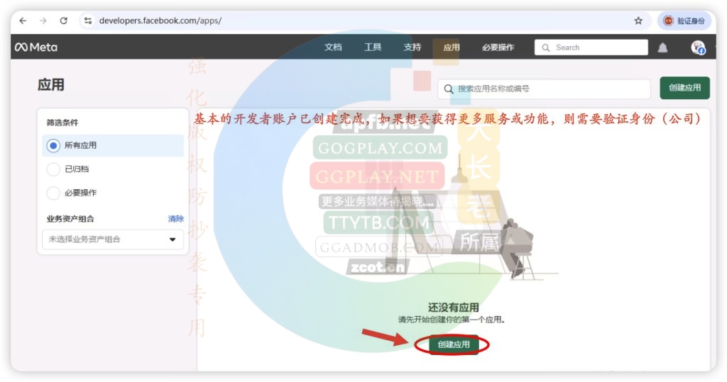 一个全新空白的开发者账户注册完成了,这个时候账户的状态是未经验证的,但可以直接发布应用了。